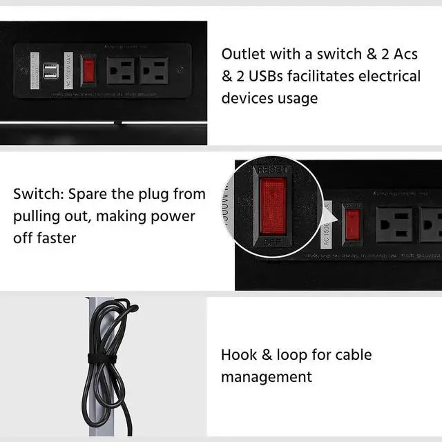 Built-in Power OutletTo ensure maximum efficiency this rolling laptop stand is fitted with a built-in power outlet. Youll have ample space to charge all your items with ease. The 1500W power outlet with a 2m long cord, 2 ACs & 2 USB ports, a switch, and a hook & loop, adopts a three-plug and a double-insulated round wire, convenient and safe!