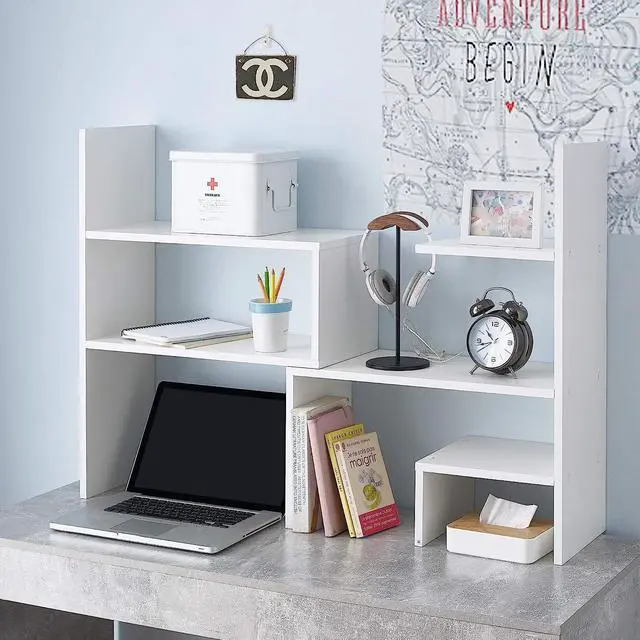 Ideal desktop bookshelf for college dorms or home office to hold essentials and stay organized!