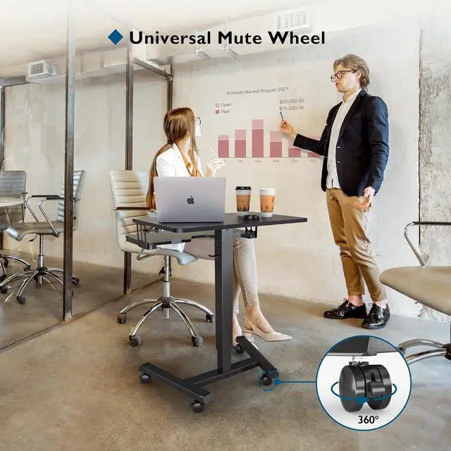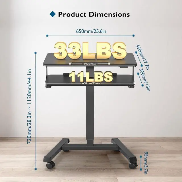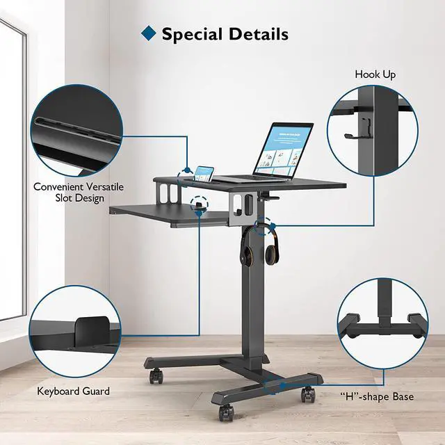 Easy to Operate: Our mobile standing desk can be set at any height. When adjusting the height upwards, press the lever with your hand and you can feel the upward force by the pneumatic spring inside the column and release the controller at your desired height. When adjusting downwards, press the lever with your hand and press the desktop at the same time.