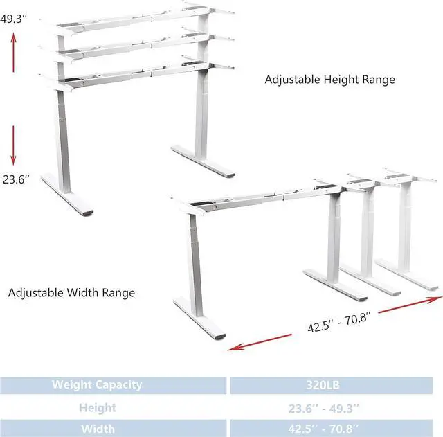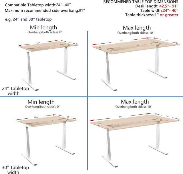 WIDTH ADJUSTMENT - Min 42.5 ' ', Max 70.9 ' ' with recommended table top sizes: length of 43 to 90, width of 24 to 40, and a thickness of 3/4 - 1.5 ' ', extended center rail at 47.2 is available to create 79.1 max width for the desk base.