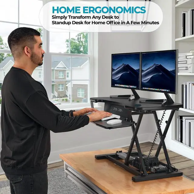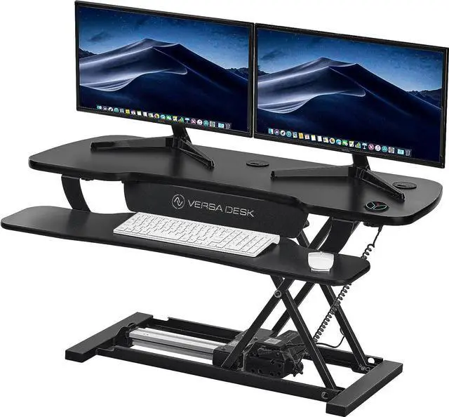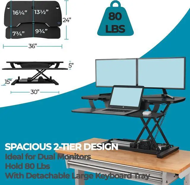 Dual Monitors: 36 inch width x 24 inch depth; Sturdily Hold 80 lbs, the new industrial standard led only by Versadesk PowerPro desk risers; 20" Height Adjustment Range is the largest, Ideal even for tall users; Transform your existing desk into an ergonomic sit-to-stand desk; Effortless, fast, smooth and quiet HEIGHT ADJUSTMENT with a push on the built-in switch; NO STOPPING POINTS RESTRICTION; Versadesk patent design under US Patent No; US 10413055 B2