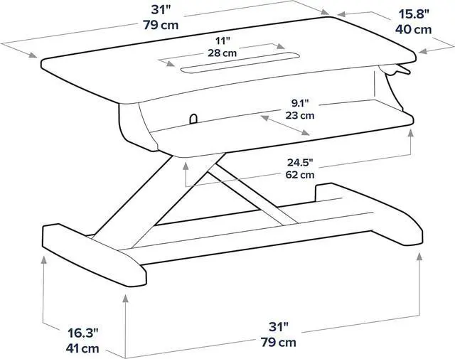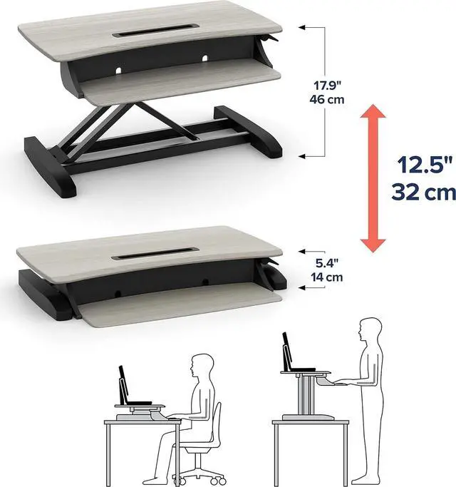 stable movement: Offers 12.5 inches of no-sway lift straight up and down; hand-brake lever allows for smooth, quick adjustments; keyboard and mouse tray moves in tandem with worksurface and is positioned 4.3 inches below it, maintaining proper ergonomic spacing