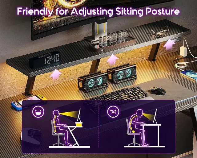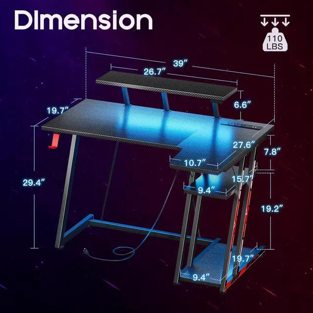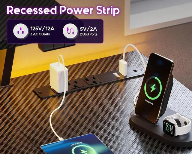 LED Strips Lights & Power Outlets: MOTPK LED gaming desk developed high-quality LED Strips to bring gamers the best gaming accessories: multi-color, multi-mode, and anti-fire. Our PC gaming desk includes a built-in socket with 2 outlets & 2 USB Ports to charge your devices for small space.