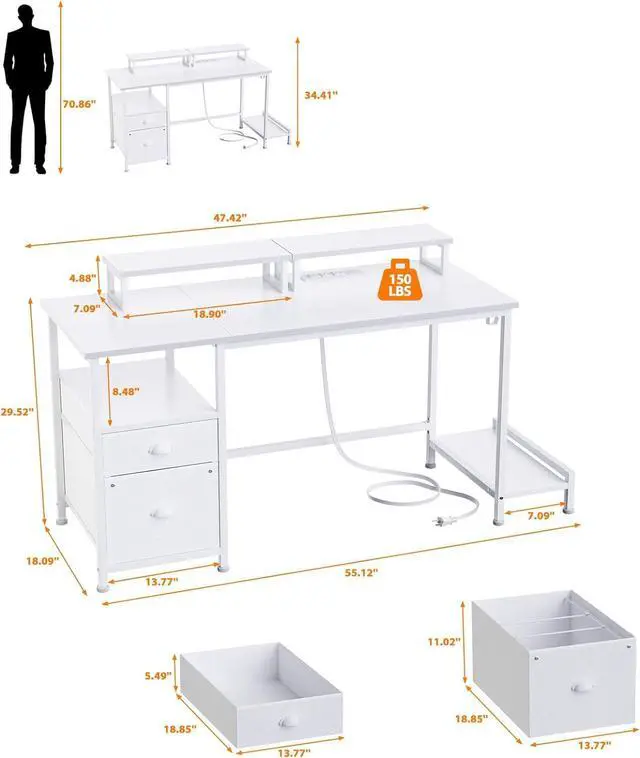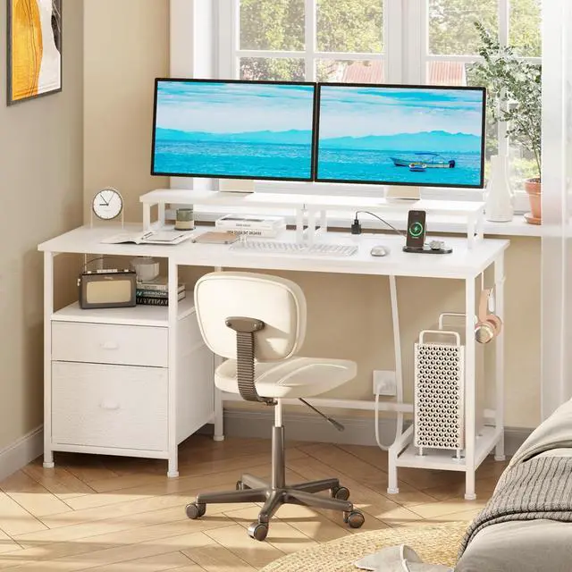 [Office Desk with Fabric File Cabinet]: The white desk is equiped with a fabric drawer and file cabinet, 2 tier storage shelves, it could be put in letter/A4 size files to prevent documents from falling into dust; placing printers, scanners or other office machines, keeps its within easy reach of desk. Ample room for your office or work-from-home needs!