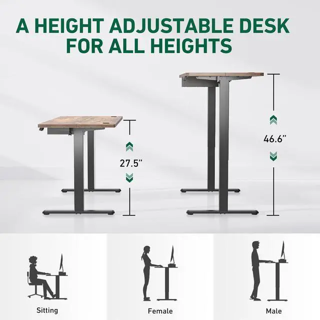 Height Adjustable Lift: The brake system is controlled by electric motors to adjust different tabletop heights from 27.7 to 46.6 Inches. 4 Positions memory functions lift conveniently and quickly. This standing desk operates with 45 db.