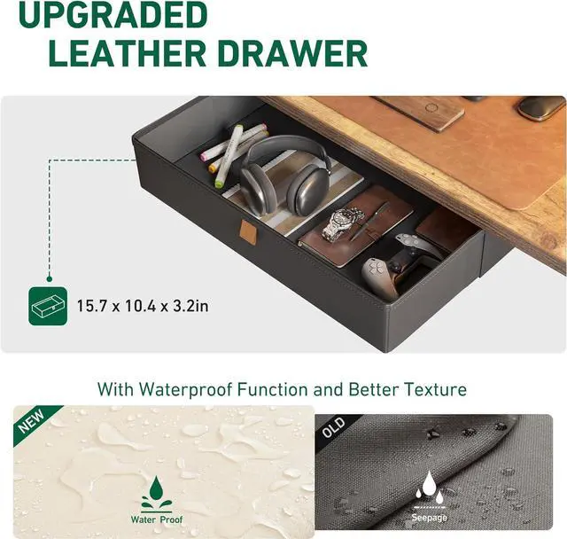 Storage Drawer: 15.7 inches wide and 3.15 inches high storage space for daily work and life. The upgraded leather drawer with waterproof function and better texture, keep your desk clean and comfortable.