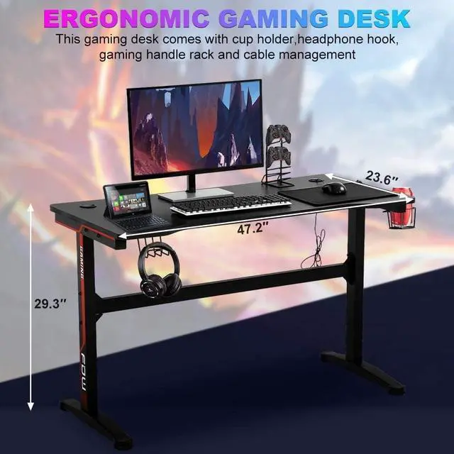 Spacious Computer DesktopThe computer gaming desk with headphone hook and cup holder, The dimensions of this T shaped gaming computer desktop are 47.2 " L x 23.6 " W, enough for your monitor, mouse and keyboard and other gaming devices, and more. For game lovers bring a better experience for each gamer.