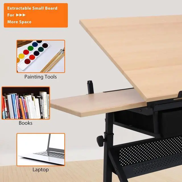 This adjustable tabletop and height drawing desk is made of high quality MDF board with PVC, durable powder coated steel frame and non-woven drawers. The sheet stopper on lip effective prevent sheets slipping