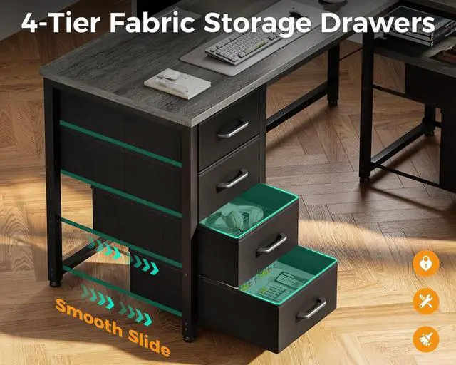 Computer Desk with Drawers & Storage ShelfThe computer desk owns five fabric drawers and one capacious fabric file drawer. You can put your office supplies or gaming equipments in to keep them in order and dust-free. The side storage shelf provides extra storage space for your books.
