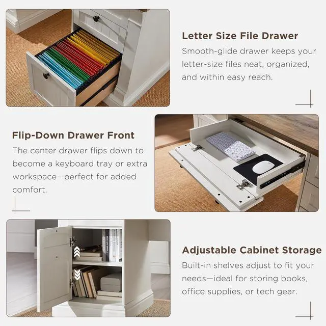 • Ample Storage for a Tidy Workspace: Keep your office organized with a large file drawer for letter-size documents, three utility drawers for supplies, and a cabinet with an adjustable shelf. A dedicated compartment also fits a vertical CPU towerso everything has its place and stays out of sight.