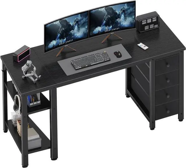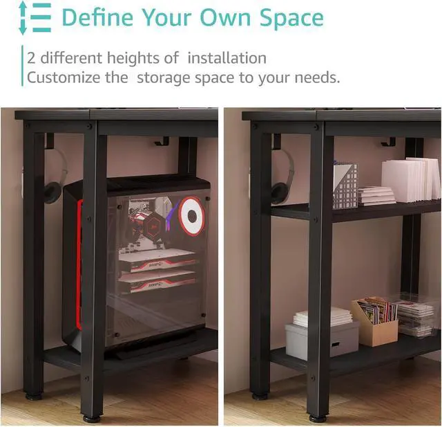 Working Desk With Ample Storage Options: Computer desk with 2 storage shelves and 4, you can try this two installation methods (left or right), and the shelves have two different heights of installation, you can customize the storage space to your needs. It also have 2 iron hooks, perfect for holding magazines, notebooks, bags or small electronics