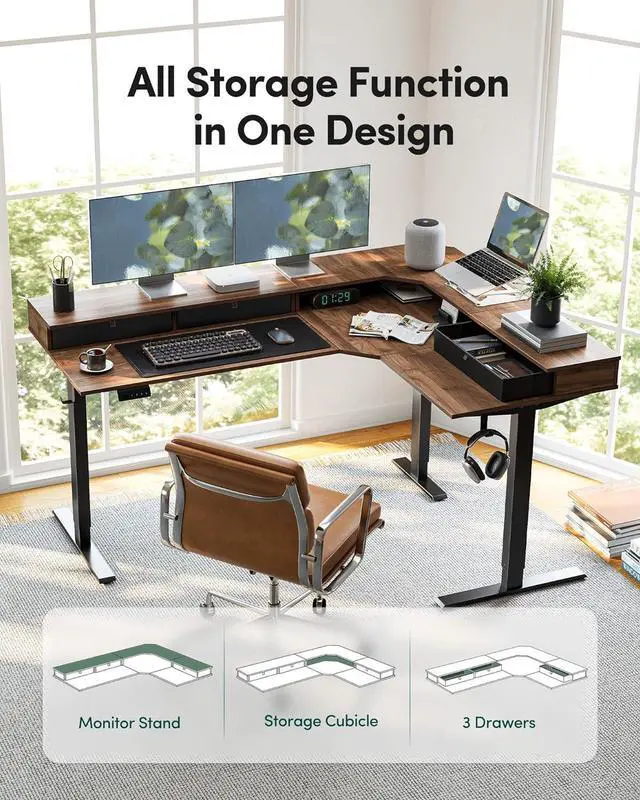 [Sturdy & Less Noise] The L Shaped Electric Standing Desk boasts a thick cold-rolled steel frame. Holds up to 176 lbs (80kg), stable with desktops, printers, file racks. This Home Office & Gaming Height-Adjustable Table lifts at 35mm/s. Noise 45dB (like soft talk). Doesnt disturb family or neighbors