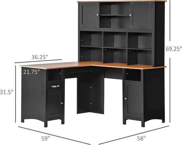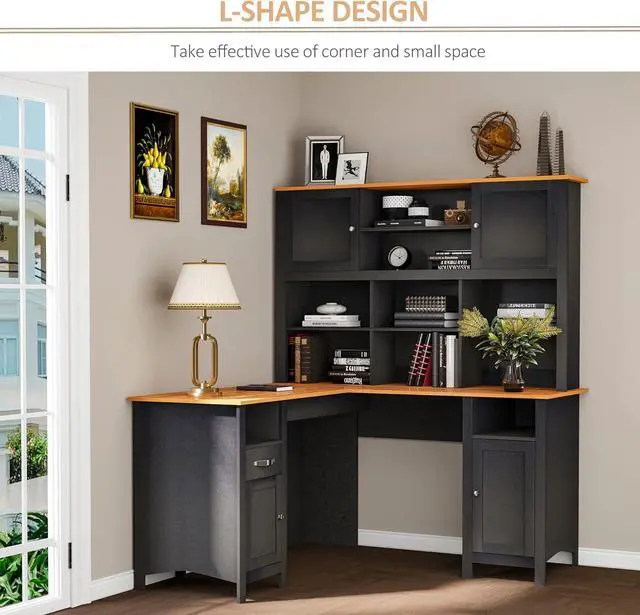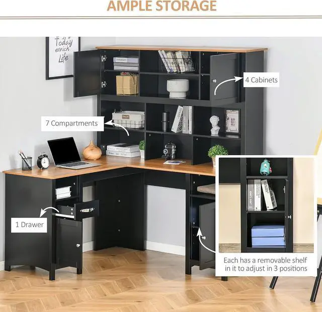 Ample Storage Space: Store your office supplies with cabinets, drawers, and open storage shelves of this home office desk. Each cabinet has an adjustable inner shelf that fits different item heights. Besides, the top storage shelves can display photos and potted plants.