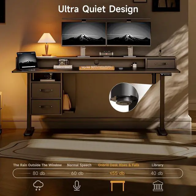 Excellent Stability: The adjustable desk' s robust desktop and the T-shaped steel frame ensure maximum stability and can hold up to 176 lbs. The lifting speed is about 55 decibels and easy to use it. The standing desk with drawers has a memory controller to save your preferred height