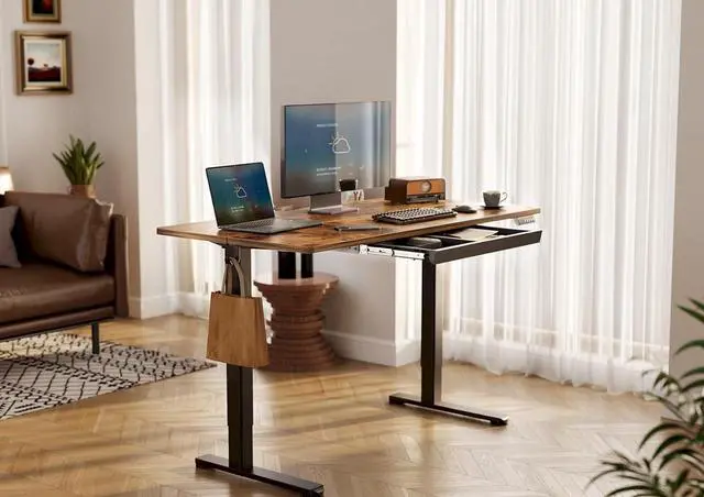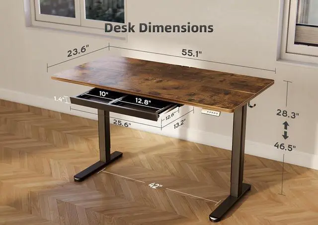 Practical Storage Drawer: Adjustable standing desk with storage drawers help keep the desktop tidy, provide ample storage space, and meet various home office needs. The drawer size is 25.6 x 12.6 inches, the maximum load capacity is 11 lbs