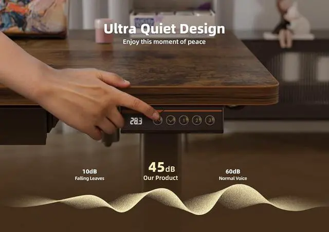 Powerful Motor: Adjustable desk equipped with a powerful and durable motor, the height adjustable desk operates quietly while being energy-efficient. The noise level is about 45 decibels, providing you with a quiet working environment