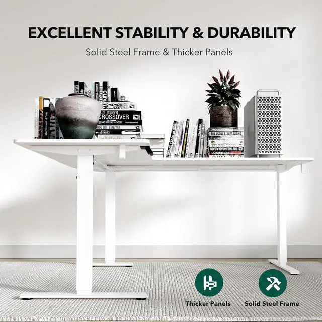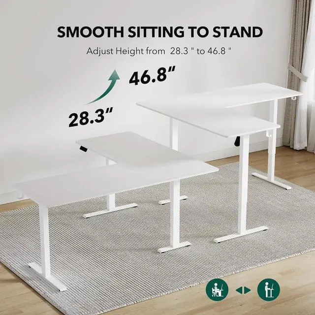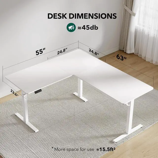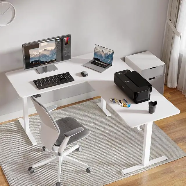 Ample Workspace: 63*55" L-shaped adjustable height desk for home office and gaming by providing large space. Large space easily holds desktop PCs, laptop, and other office accessories.