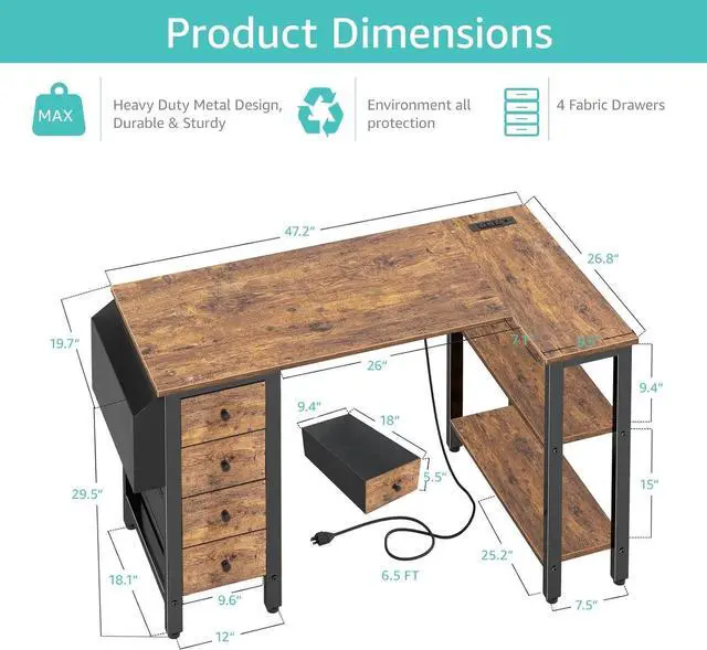 Vintage Style Design: Computer desk with 2 storage shelves and 4 with wooden front, you can try this two installation methods (left or right), and the shelves have two different heights of installation, you can customize the storage space to your needs. This desk is made of thick P2 particle wood board with scratch-resistant, anti-collision and waterproof, protect home office desk surface from daily wear and tear.