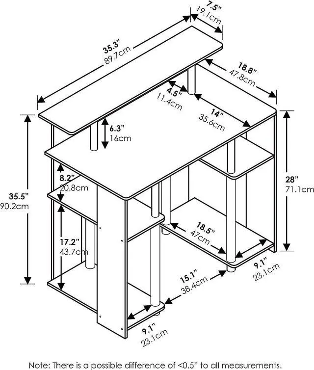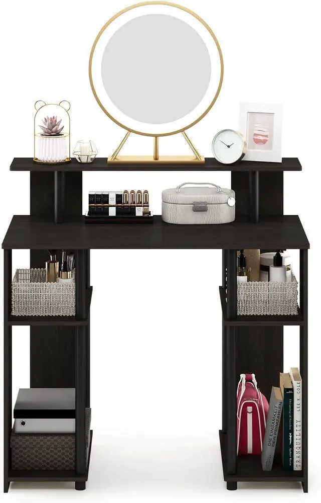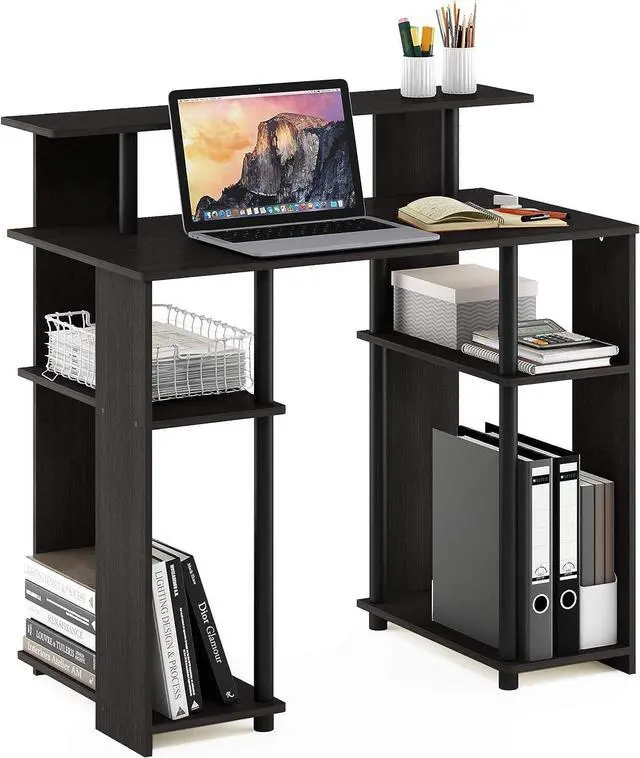 Simple stylish design features shelves on both sides for CPU and books, elevated shelf for a compact printer or other stationery decor