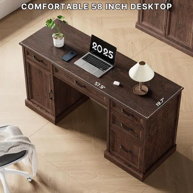 Farmhouse Style & Spacious Design58" executive desk combines rustic farmhouse charm with a spacious surface, perfect for organizing laptops, monitors, and office supplies. Embossed texture on wood desk adds unique touch, blending seamlessly into home offices, studies, or modern workspaces.