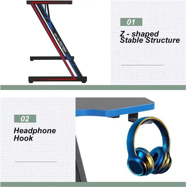 Sturdy Z-Shaped StructureThe gaming table has strong structural design, function and stability. High quality metal frame and Z-shape design make the home office desk good stability and strong bearing capacity. Adjustable leg pads ensure that the PC gaming desk remains stable even on uneven ground.