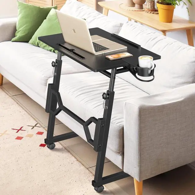 Portable Desk on Wheels: Tall desk adjustable height 27.25 inch- 41.73 inch for you to sit or stand, 23.62 inch x 15.74 inch desktop for more storage space, smooth 360 degree rotation wheels make desk move wherever you want