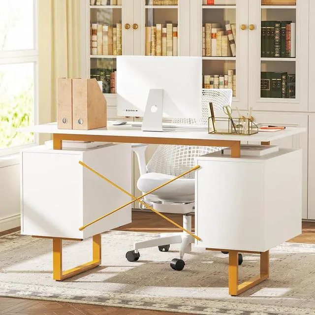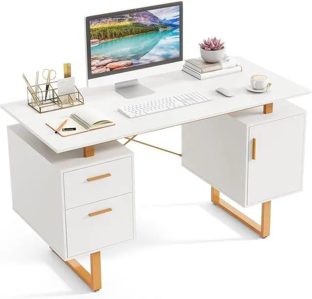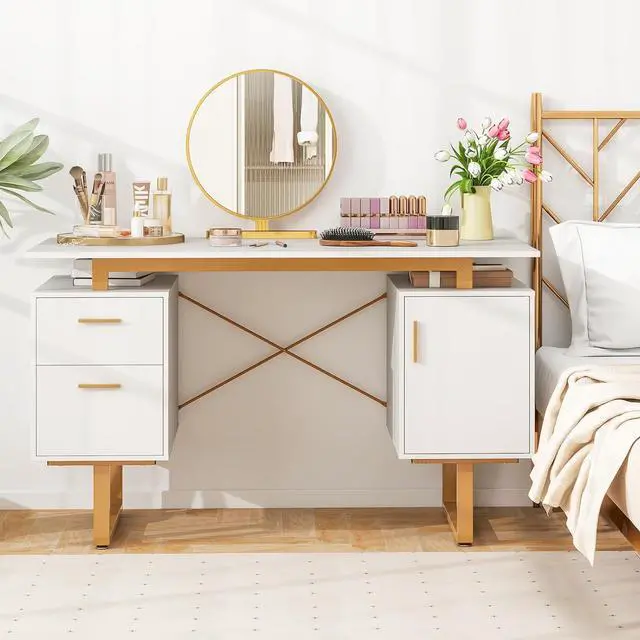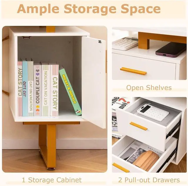 Modern Elegant Design: The sleek white finish combined with a stylish golden frame creates a contemporary aesthetic, elevating the decoration of any living room, study, office, or bedroom. The white desk adds both style and functional storage to your home.