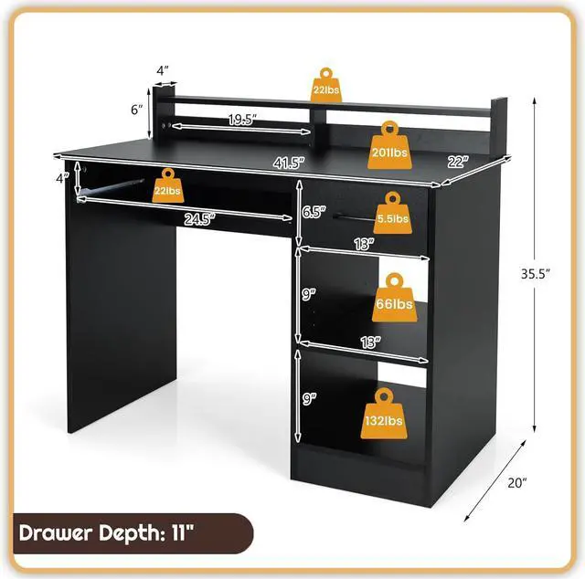 Keyboard Tray]: With a 41.5 " x 22" wide desktop, the computer desk not only keeps daily essentials within reach, but also provides enough work space for home office activities. In addition, the design of the keyboard tray with metal slide rail will make you feel more convenient when you place the monitor on the tabletop.