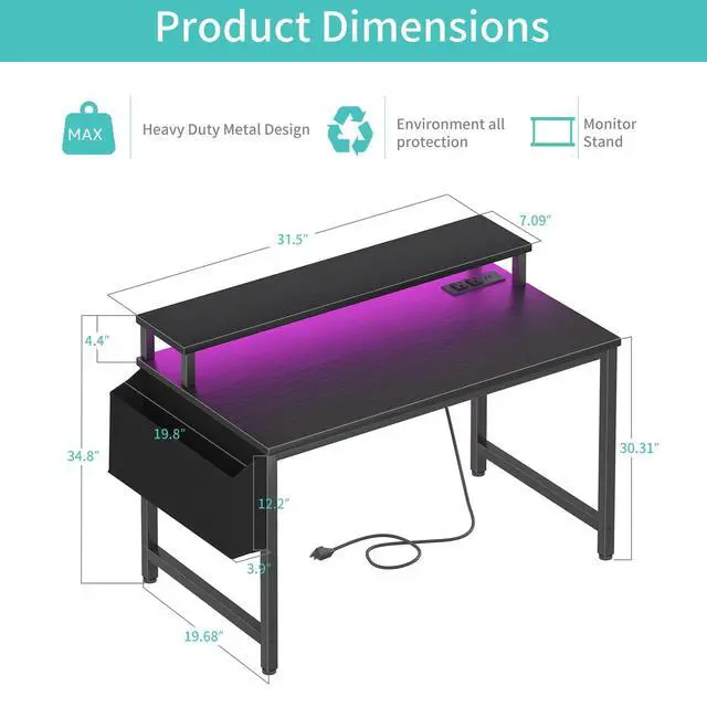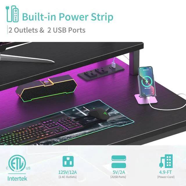 Safety Multi-functional Power Strip: The computer desk includes a built-in power strip with 2 power outlets & 2 USB charging ports for your computer, monitor, gaming gear, pad, phone and other electronic devices