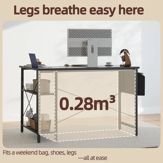 Small Desk with Spacious Storage - The small desk offers 2-tier under desk opening shelves to help organize books and files, yet its small size and corner design fits perfectly into corner space, which is a perfect solution to maximize limited workspace, Max static load capacity 220lb.