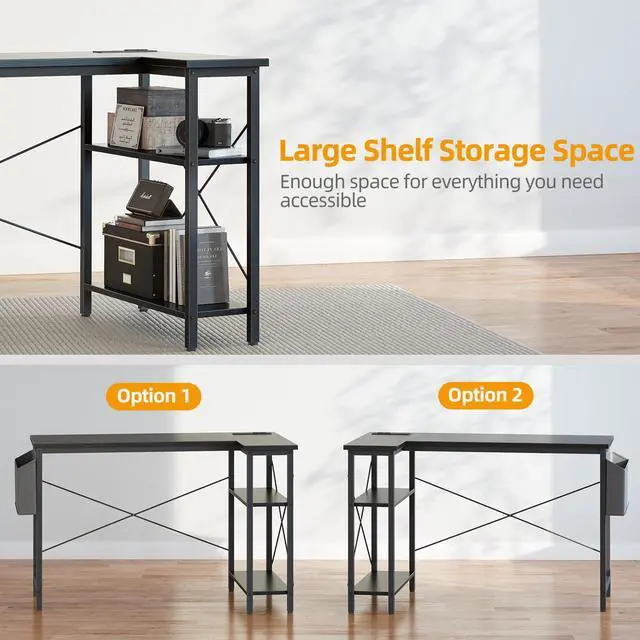 Small L Shaped Desk with Power Outlets - 40 inch Gaming Corner Computer Desk Writing Table, Reversible Large Storage Shelves, Bookshelf Workstation for Study Play Work Home Office, Black