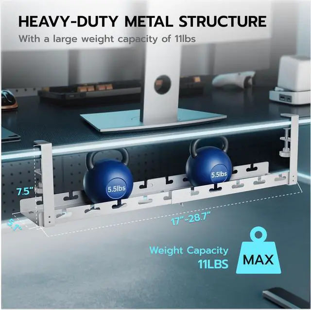 Durable Metal Build for Long-Term UseCrafted from robust, fully welded steel with a smooth powder-coated finish, this cord organizer for desk resists rust and minimizes dust buildupeven with long-term use under your desk. It supports up to 11 lbs of weight, making it a dependable solution for keeping cables, power strips, and adapters organized.