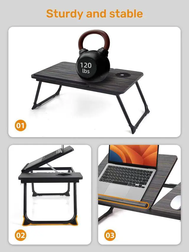 [sturdy and stable] :the laptop desk table has metal locks to lock the legs in place while you use it. You won't have to be concerned that the legs will buckle and fall on your lap And the legs, themselves, are metal, as well, with little rubber "feet" on the corners to keep the table still on any surface