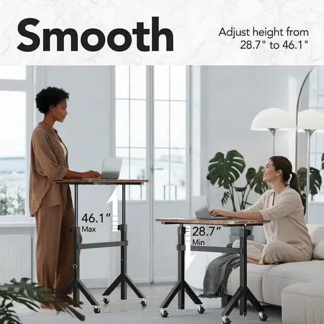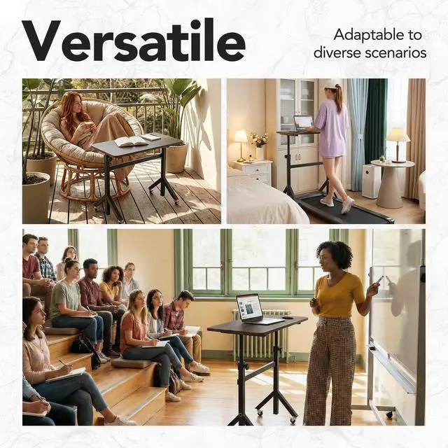 Transform Your Flexible Workspace Upgrade your active lifestyle with the HUANUO Mobile Stand Up Desk, your ultimate Portable Standing Desk and Walking Pad Desk solution. This versatile Desk on Wheels combines smooth mobility, all-wheel stability, and a wide Adjustable Height range from 28" to 46" to perfectly fit your work-from-home or walking pad routine. Sturdy & Stable Mobile Desk Engineered with a unique Y-shaped base and a reinforced steel frame supporting 200 lbs, this Rolling Desk remains incredibly solid and wobble-free. It provides a reliable, sturdy surface as a Treadmill Desk or for your leisure activities, even at its full height. Smooth Mobility with All-Wheel Lock As a truly Portable Desk on Wheels, it glides effortlessly on four 360° swivel casters. Each wheel features an individual lock, instantly transforming this Mobile Rolling Desk into a steadfast and secure workstation wherever you need it. Wide & Effortless Height Adjustment Easily switch between sitting and standing with a generous adjustable height range. This Adjustable Height Rolling Desk promotes better posture and is the ideal Standing Desk for Walking Pad, perfect for your laptop, projects, or reading. Compact & Durable Rolling Computer Table The scratch-resistant surface is built to last and easy to clean. This space-saving Mobile Desk is designed for quick assembly with all tools provided, making it perfect for your home office, apartment, or dorm room. Your All-in-One Mobile Workstation Perfect as a bedside Rolling Desk, a sofa-side Portable Standing Desk, or a kitchen Mobile Stand Up Desk, this versatile Desk for Treadmill delivers both function and modern style to any room in your home.