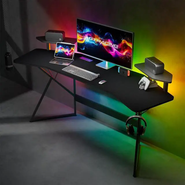 The GTRACING Wing-Shaped Gaming Desk, where functionality meets cutting-edge design. Built with an aircraft wing-shaped desktop, this desk offers a sleek and aerodynamic design that maximizes space for your gaming gear while adding a modern touch to your setup. The RGB lighting adds vibrant colors to your gaming environment, allowing you to customize your lighting effects to match your style, creating the perfect atmosphere for every gaming session. The desk features a removable desk-on-desk design, providing an extra surface to organize your equipment or work materials. Stay powered up with the integrated power socket, ensuring all your devices stay charged and ready for action. The cable management tray helps you keep your desk organized, neatly storing cables to prevent clutter and improve the overall aesthetic of your setup. For added convenience, the desk comes with a cup holder to keep your drink within reach and a headphone hook to securely store your headphones when not in use. The GTRACING Gaming Desk is the ultimate choice for gamers who demand both style and practicality. Maximize your gaming experience with a desk designed for both performance and organization.