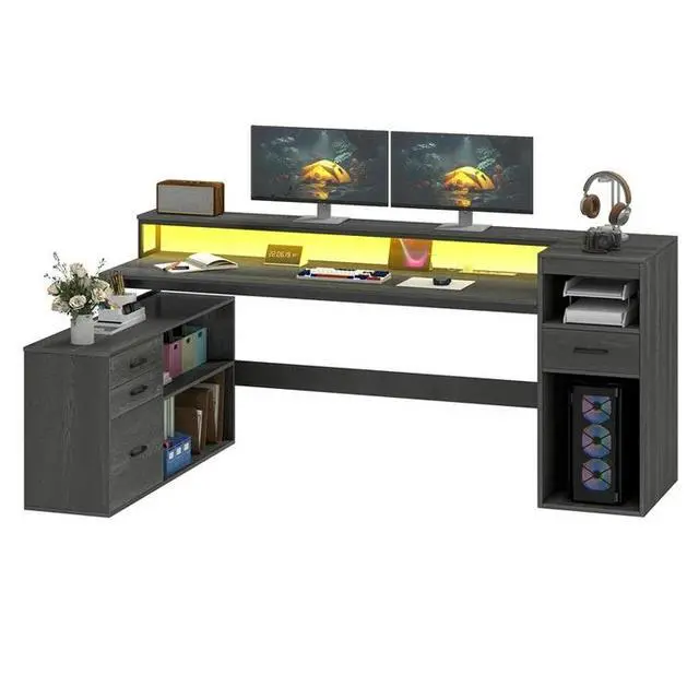Work smarter, not harder, with this charcoal gray L-shaped desk. Its 2-tier tabletop keeps your monitors and keyboard ideally arranged, while 3 drawers, 3 open cubbies, a CPU compartment, printer stand, and an adjustable file cabinet store everything you need within reach. Plug in with 4 AC outlets, 2 USB ports, and a 6.56 ft cord, and light up your desk with the built-in RGB LED strip for a fun ambiance. Made from engineered wood and reinforced steel, this desk is built to last.