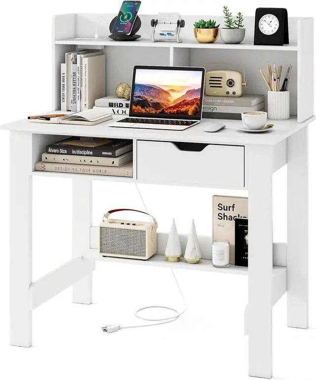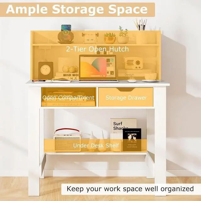 Ample Storage Space: Need a place for all your essentials? This writing desk has got you covered with a 2-tier open hutch for display, an open compartment, a storage drawer for private items, and an under-desk shelf for extra storage. Say goodbye to clutter and hello to organized work space!