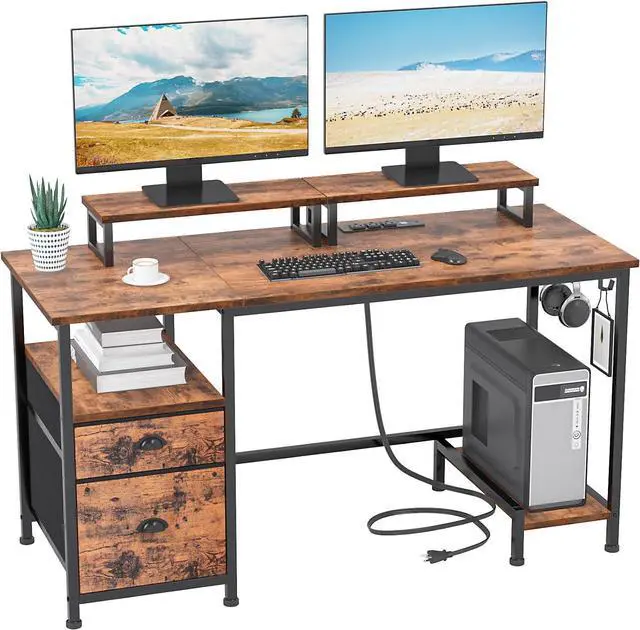 [More Storage Capacity Desk]: 47" computer desk with a file cabinet and 2 monitor stands, provids you plenty of storage room for your books, working documents; additional two hooks on side, you can place backpack, headphone, etc. space saving and making your tabletop more organized.