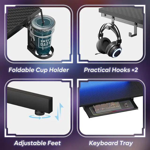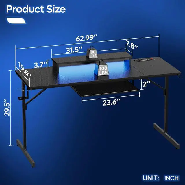 PC Gaming Desk with LED LightsThis 63 inch computer desk with LED lights offering 7 color options and 22 dynamic modes. Choose your mood or create your own ambiance while enjoying thrilling gaming sessions with friends and family. This gaming desk can meet you play games for your home offices