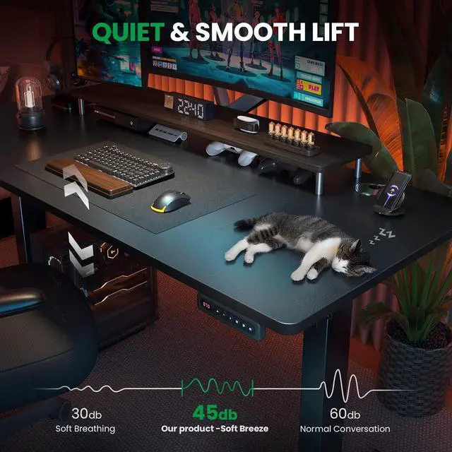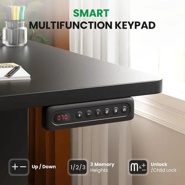 Customized Sit Stand Desk: The reliable motor operates quietly (under 45 dB) and smoothly, all your things stay steady&secure in motion. The intuitive control panel allows you to preset 3 preferred heights, switch between sitting and standing positions has never been easier. Child lock for total peace of mind.