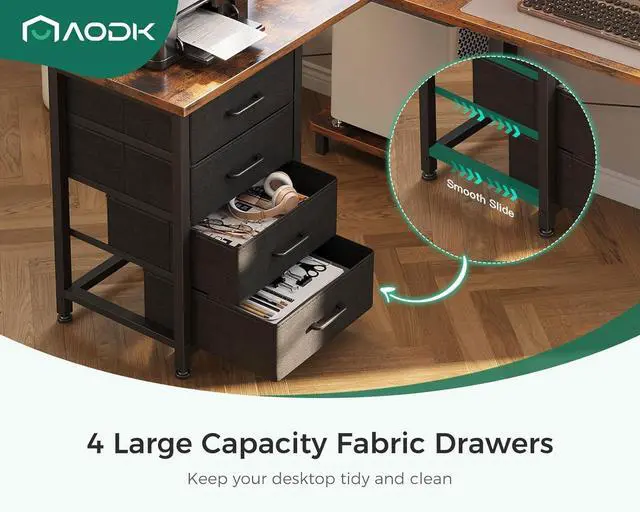 Optimized Storage SpaceFeaturing 4 spacious drawers and 2 sturdy iron hooks, this L-shaped desk maximizes organization by effortlessly accommodating documents, stationery, and personal items. Its thoughtful design keeps your workspace uncluttered, while the ample surface area supports your printer, scanner, and more, ensuring everything is conveniently at hand.