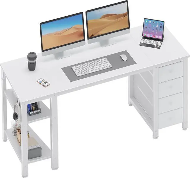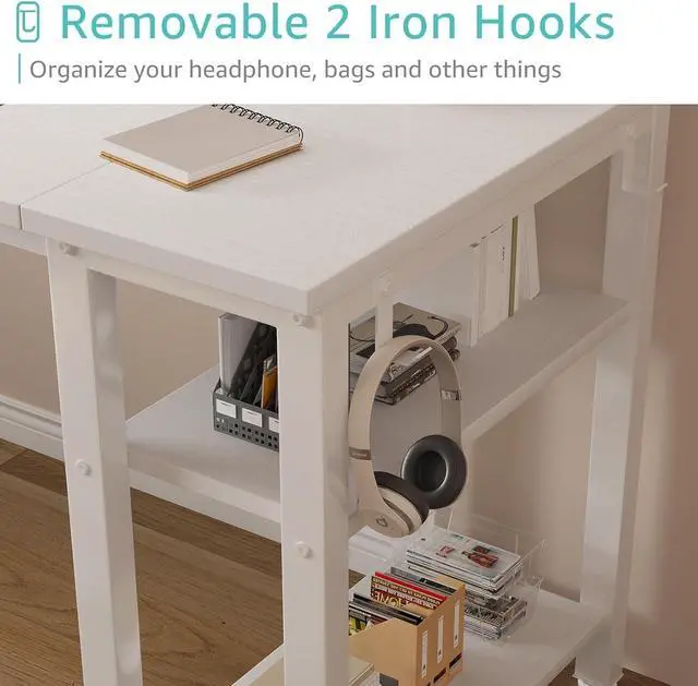 Working Desk With Ample Storage Options: Computer desk with 2 storage shelves and 4, you can try this two installation methods (left or right), and the shelves have two different heights of installation, you can customize the storage space to your needs. It also have 2 iron hooks, perfect for holding magazines, notebooks, bags or small electronics