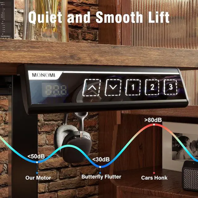 Outstanding Stability--This standing desk has a sturdy solid steel frame with aerospace-grade lifting column connectors. Even at full height, Monomi electric standing desk can eliminated any distractions from wobbling. The reliable motor operates quietly (under 45 dB).
