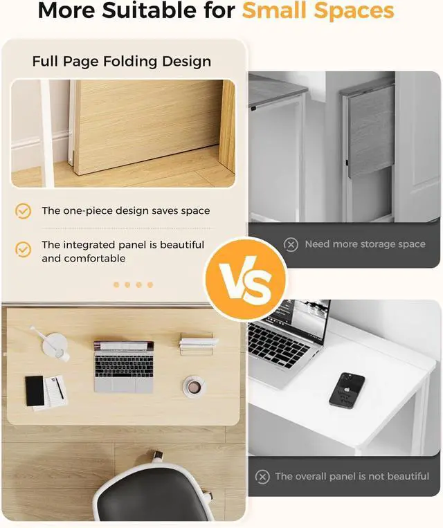 EASY TO STORE: the desktop adopts a new type of table board, which is not separated, The entire desktop can be folded directly for storage, the product size is 2.6 inches deep x 31.5 inches wide x 29.5 inches when folded, It can be easily stored in corners, gaps, etc, when not in use to keep the room tidy