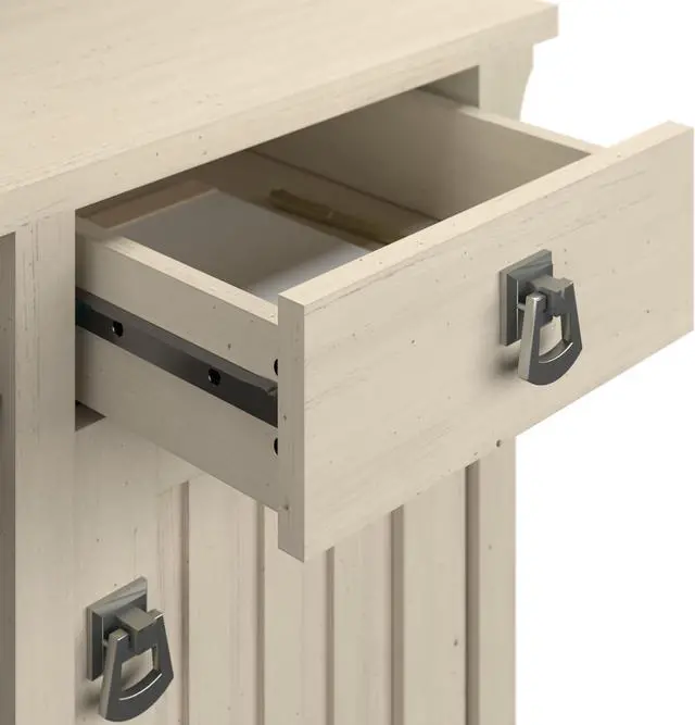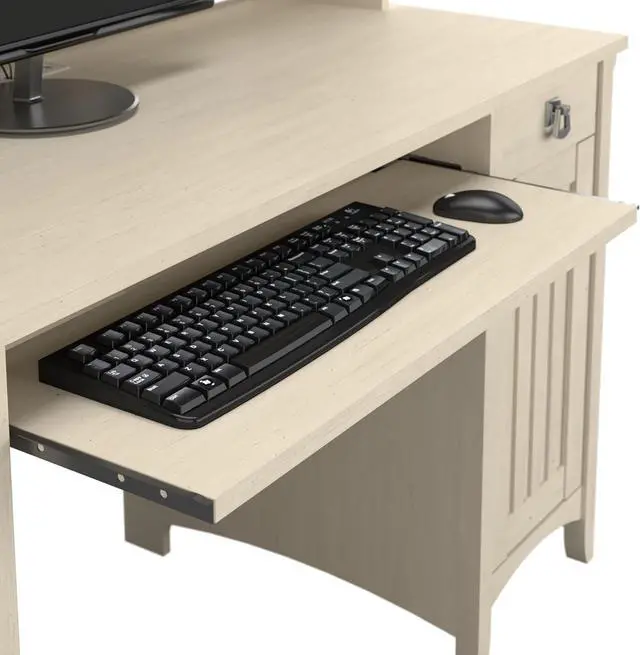 Convenient pullout shelf accommodates a keyboard or laptop; vertical storage cabinet and box drawer keep supplies close by