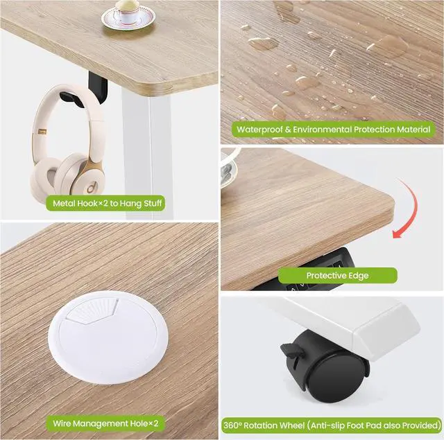 Spacious Tabletop and Practical DesignThe large 48" x 24" stand up desk surface provides ample space for a variety of office tasks. The tabletop is water and wear-resistant and comes with a wire collection hole to keep your office area neat and tidy. The sit stand desk comes with two additional hook accessories for hanging headphones, umbrellas, or other items. Oak tabletop with white frame, Simple and advanced, perfectly matching your home style