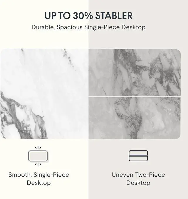 • 1" THICK ONE-PIECE DESKTOPExperience the elegance of a completely smooth, seamless desktop surface. This design not only enhances the aesthetic but also ensures a sturdier and more stable structure compared to spliced tabletops.