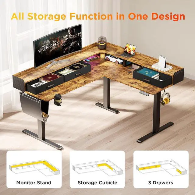 Spacious L-shape Workstation: WALKINGDESK electric standing desk has 3 spacious drawers, a spacious storage cubicle, and a dedicated monitor shelf to keep your work essentials organized, such as headphones, controllers, pens or other accessories. L shape design is very nice in a corner at your home and maximizes help you to save space, and the round corner design better protects your family from hurting.