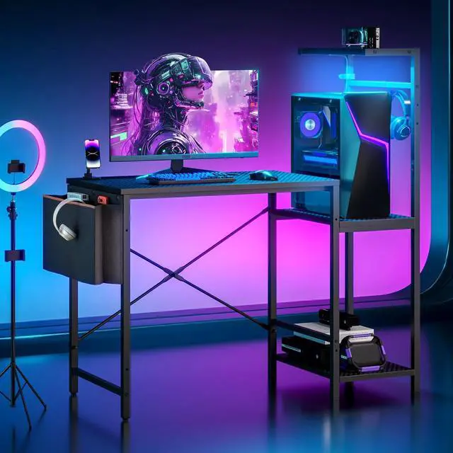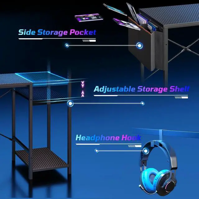 Bestier Gaming Desk with LED Lights, 44'' Computer Desk with Reversible Shelves, PC Gamer Desk with Side Storage Bag, Hooks and Height Adjustable Shelf for Home Office, Carbon Fiber Black