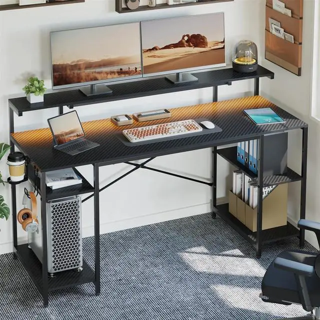 Bestier 55" Gaming Desk with LED Light & Monitor Stand Computer Desk Corner Desk for Home Office, Black Carbon Fiber